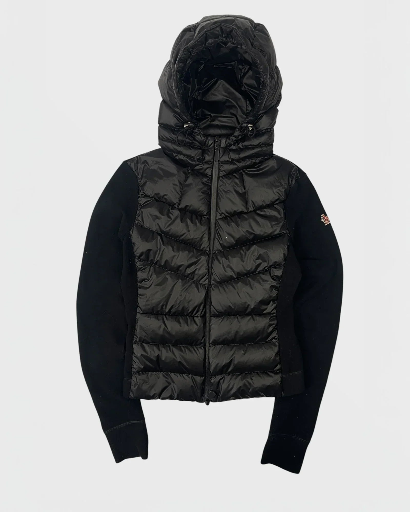 Corps matelassé en nylon brillant, manches contrastées en tissu aspect laine, grande capuche ajustable, fermeture zippée, logo sur la manche gauche, finitions modernes.